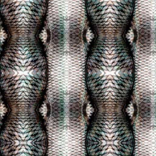 Pearlescent multitude of tones and wet-look armour. Interlocking of bronzy coppers and teals and intricate fish scales of geometric patterns.