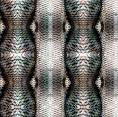 Pearlescent multitude of tones and wet-look armour. Interlocking of bronzy coppers and teals and intricate fish scales of geometric patterns.