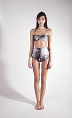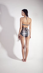 This 50's style High-waisted Twisted-bandeau bikini in Bjork print from the AELLAI collection, features lightly padded cups, boning and detachable skinny straps for added subtle support.