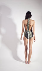 The Marilyn one-piece in the Salamander print, from our AELLAI collection. This is a 50's inspired swimsuit with deep plunge, V neck halter with thick ribbon straps. Each piece has a totally unique print, as no two pieces are cut exactly the same.